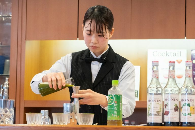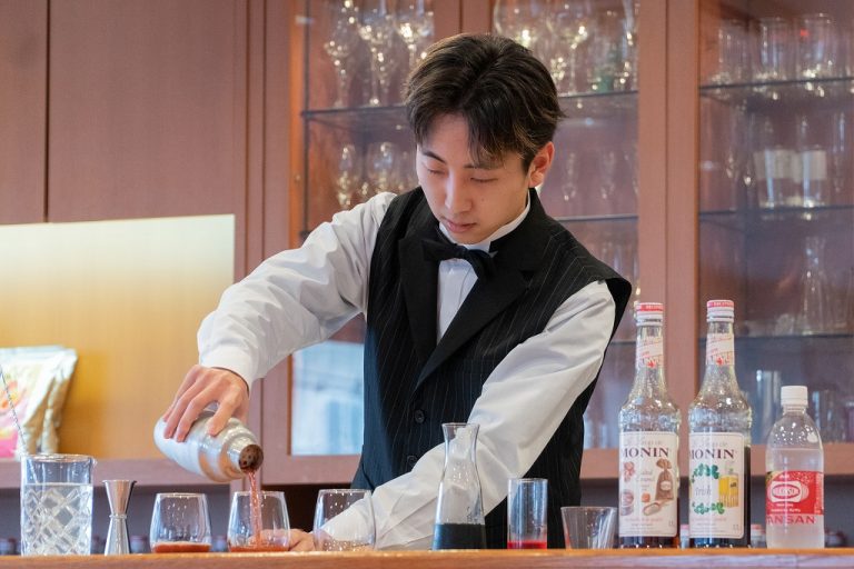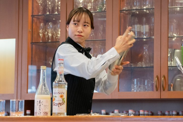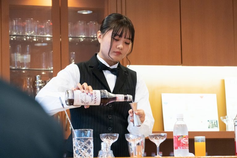 審査の対象はカクテルの味だけではなく、試技所作、そして創作したカクテルのプレゼンも含まれます。学生たちは、何度も試作や練習を重ねてこの日を迎えました。