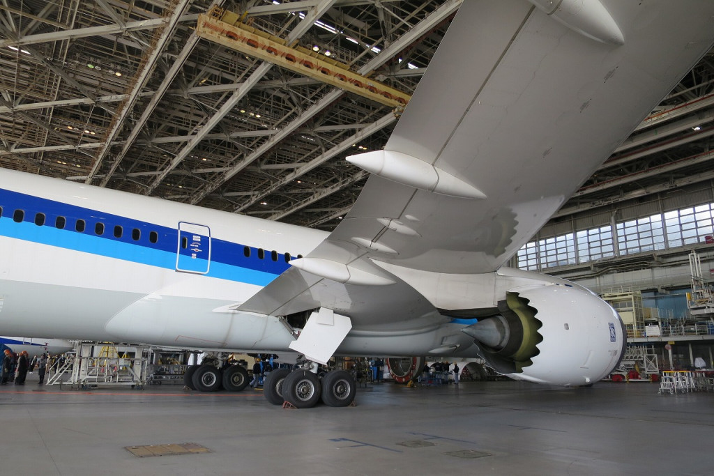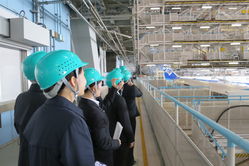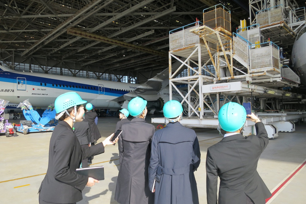 機体整備工場(ANA Blue Hangar Tour)の見学では、実際に稼働する飛行機を間近で見学し、その圧倒的なスケールと迫力に学生たちは大興奮でした。